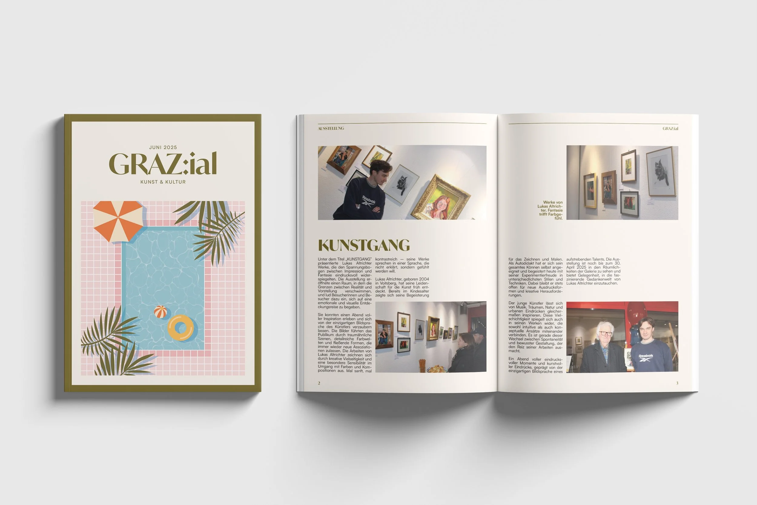 This project was created as part of my User Interface Design course (IND23) with a team of 17 students. The goal was to design a cultural platform that could reconnect people across Graz’s art and cultural scene — a response to reduced funding and the growing disconnect between smaller creative communities. I took on the role of project lead and coordinator, overseeing research, data analysis, and concept development while ensuring visual and structural cohesion throughout the process. Alongside managing the team, I led the design of the Open Gallery section — a digital exhibition space that complemented the main app and accompanying print medium, all developed to strengthen community, accessibility, and connection through thoughtful design.