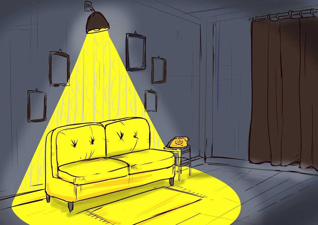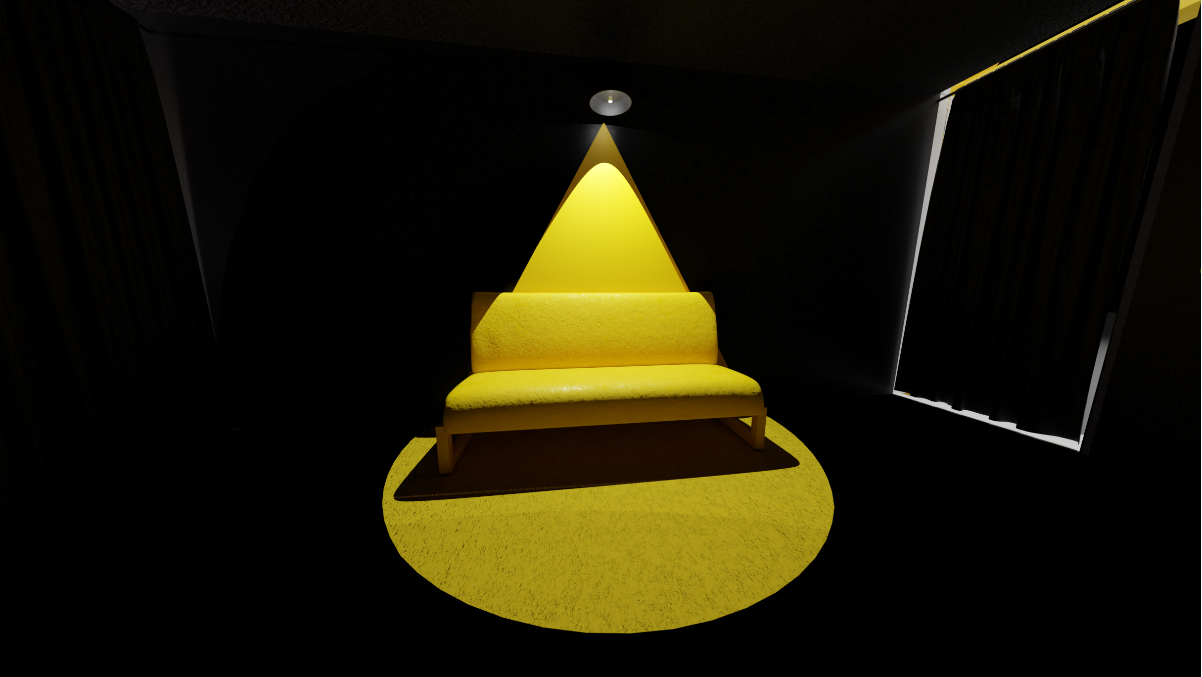 Inside the exhibition space, a projection played an abstract animation that people can view inside the exhibition as they rest on a yellow sofa. It’s accompanied by music, offering a glimpse into what living under such conditions might feel like.