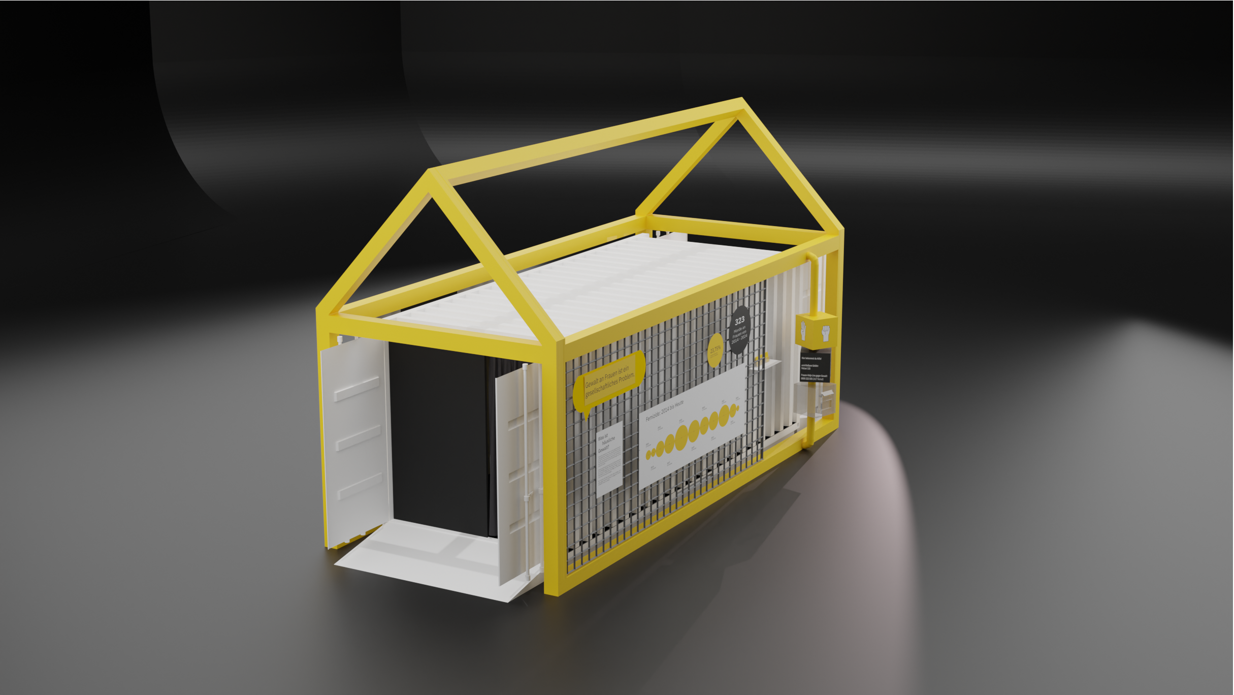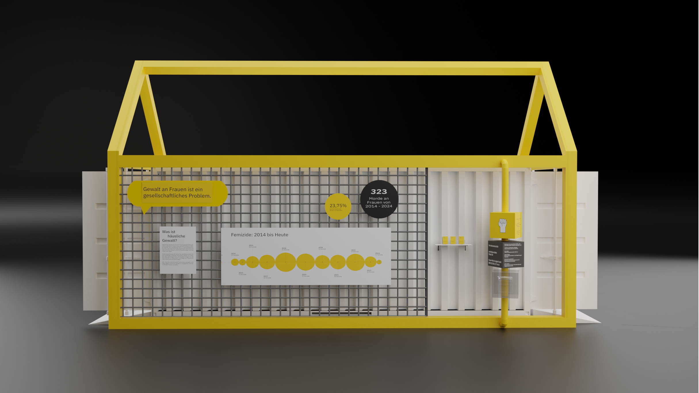 The container takes the shape of a house. Welcome Home is an exhibition focused on shedding light on domestic violence and providing clear resources for support. Infographics, an animated video, and helplines are key elements visitors encounter both inside and outside our planned exhibition.