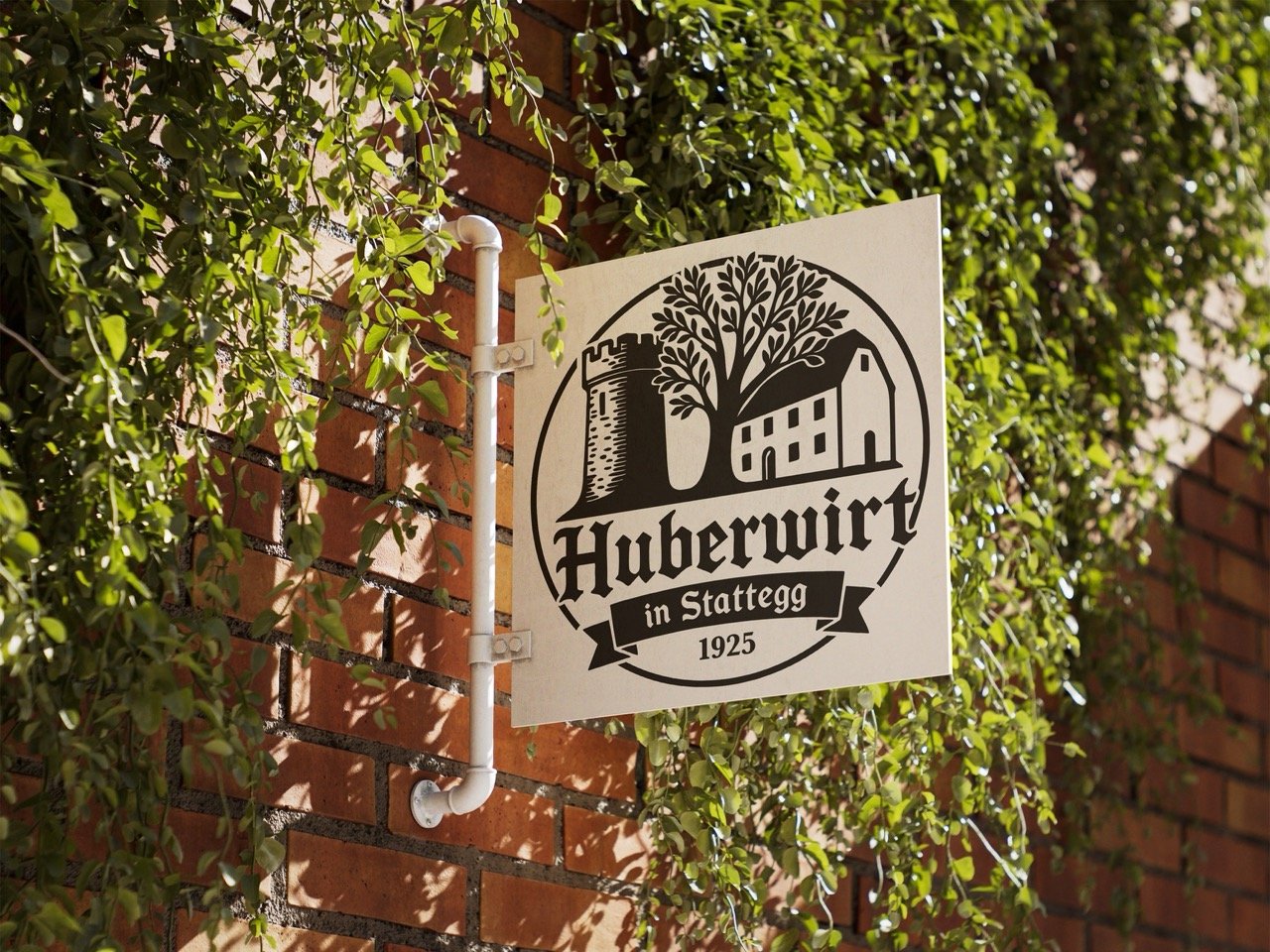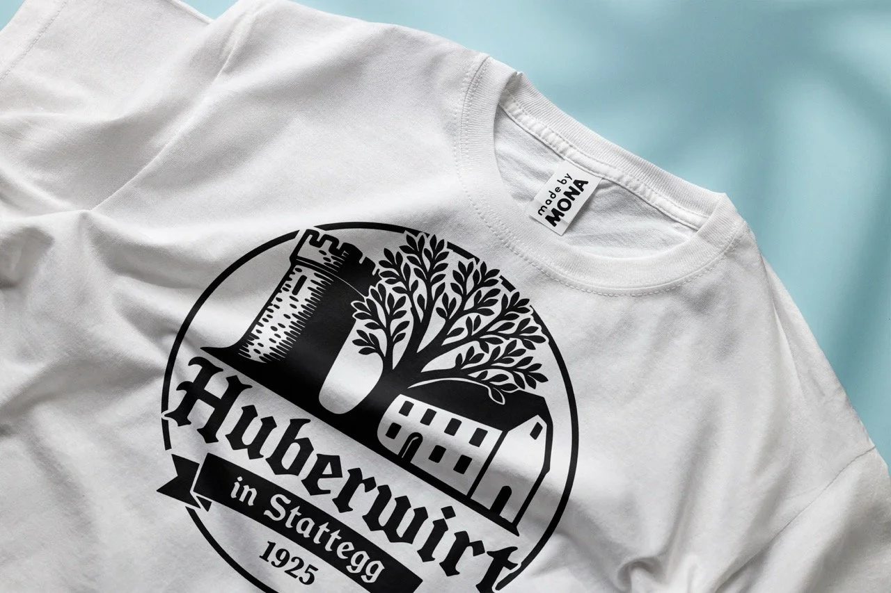I designed the logo for Huberwirt, a local inn with decades of history and deep roots in the region. The castle and tree — both important symbols for the inn — were included at the owners’ request to highlight its unique character.
