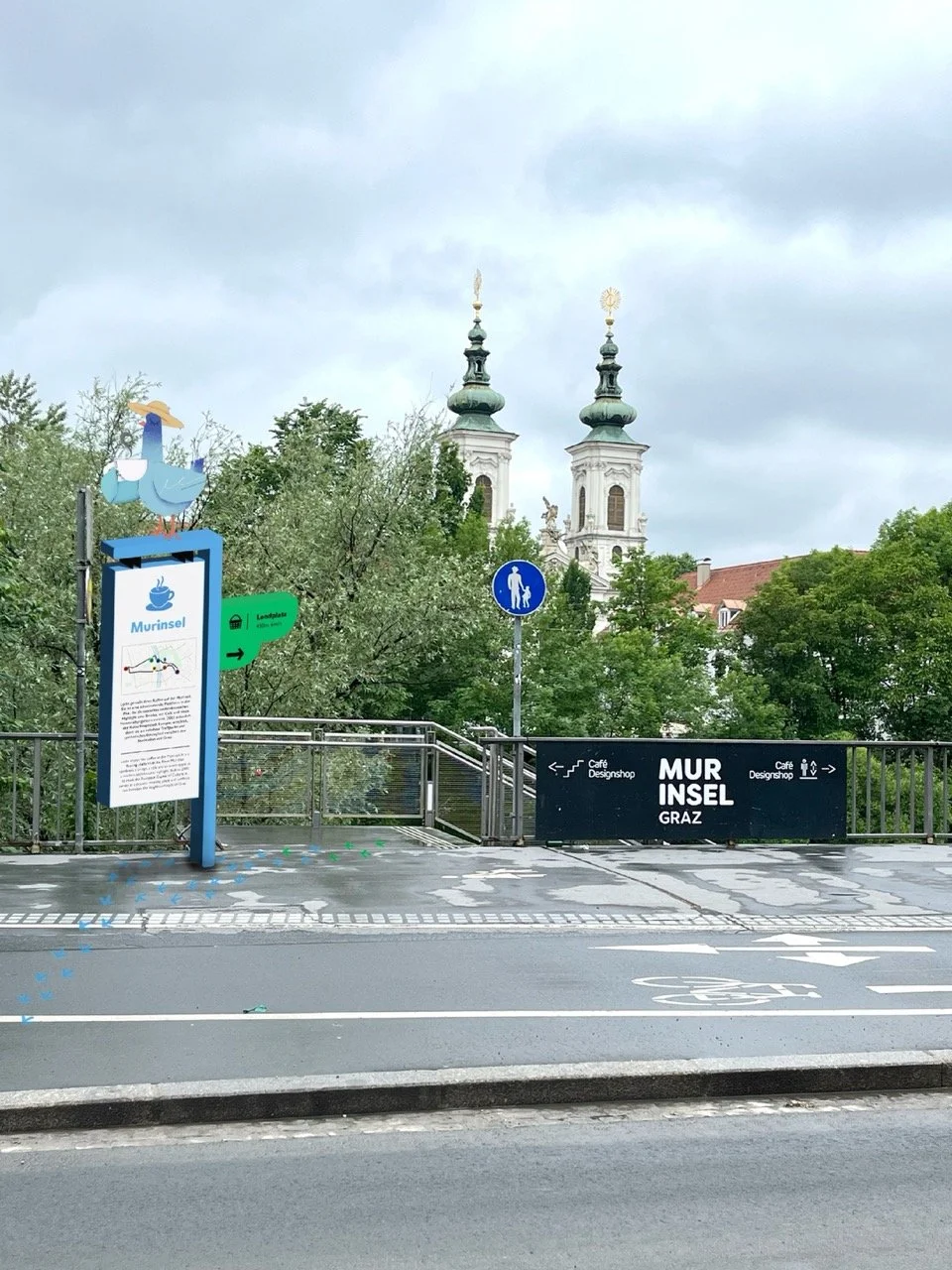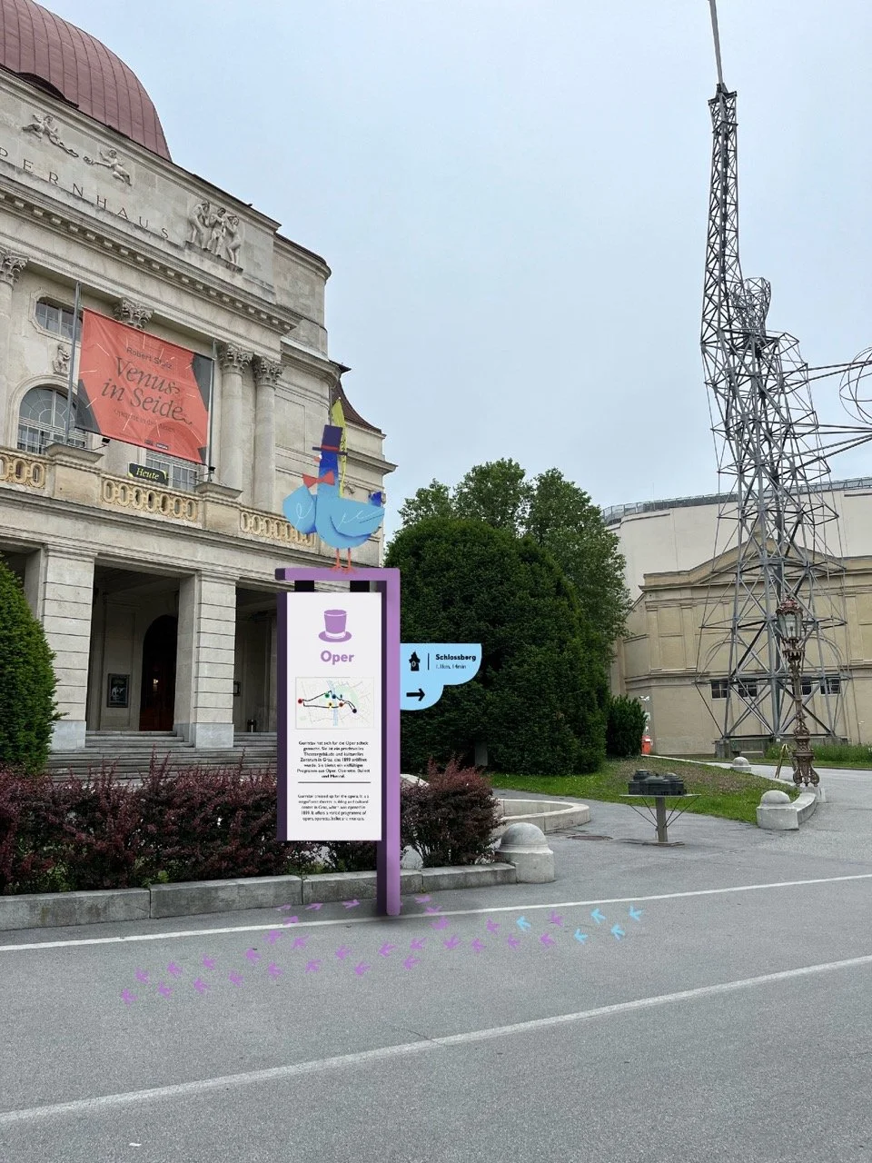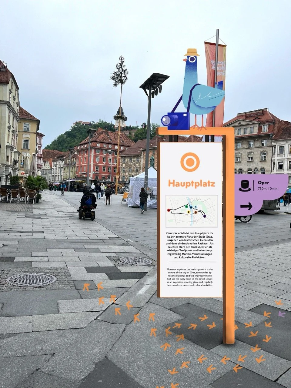 These two pigeons are Lotta and Gurrstav, two charming birds here to guide us through the city of Graz. This project focused on designing a wayfinding system to help people navigate the city. I came up with the idea of using these two friendly pigeons as visual guides leading pedestrians from the main train station on a looping route through Graz.